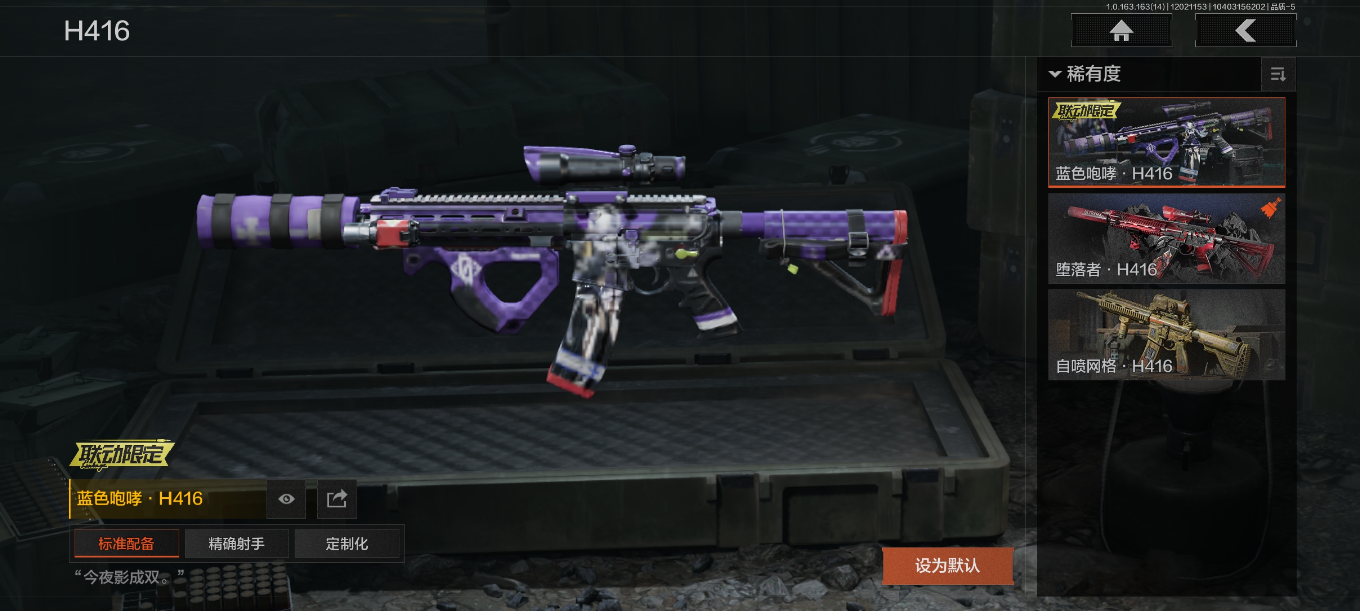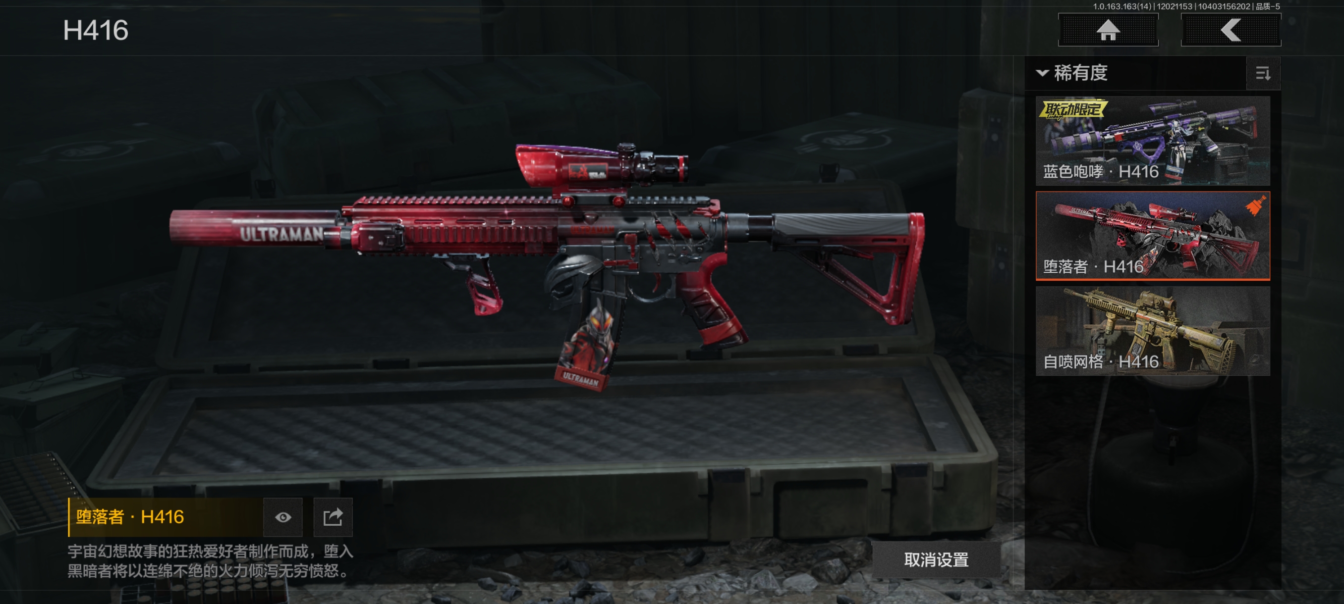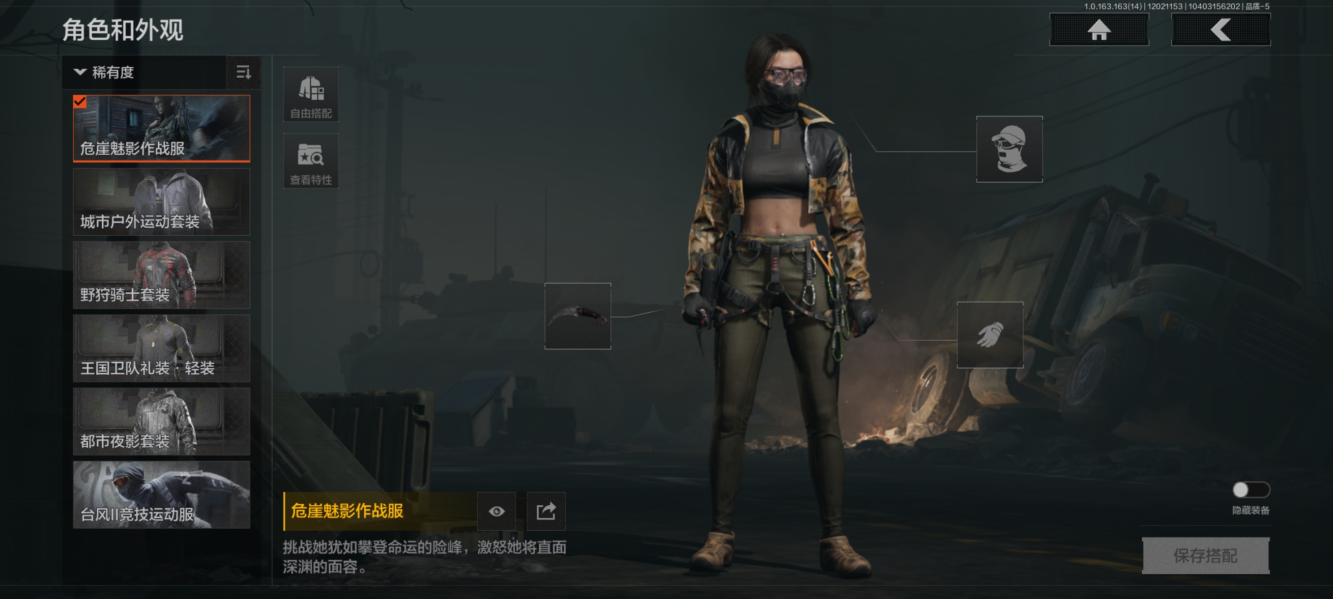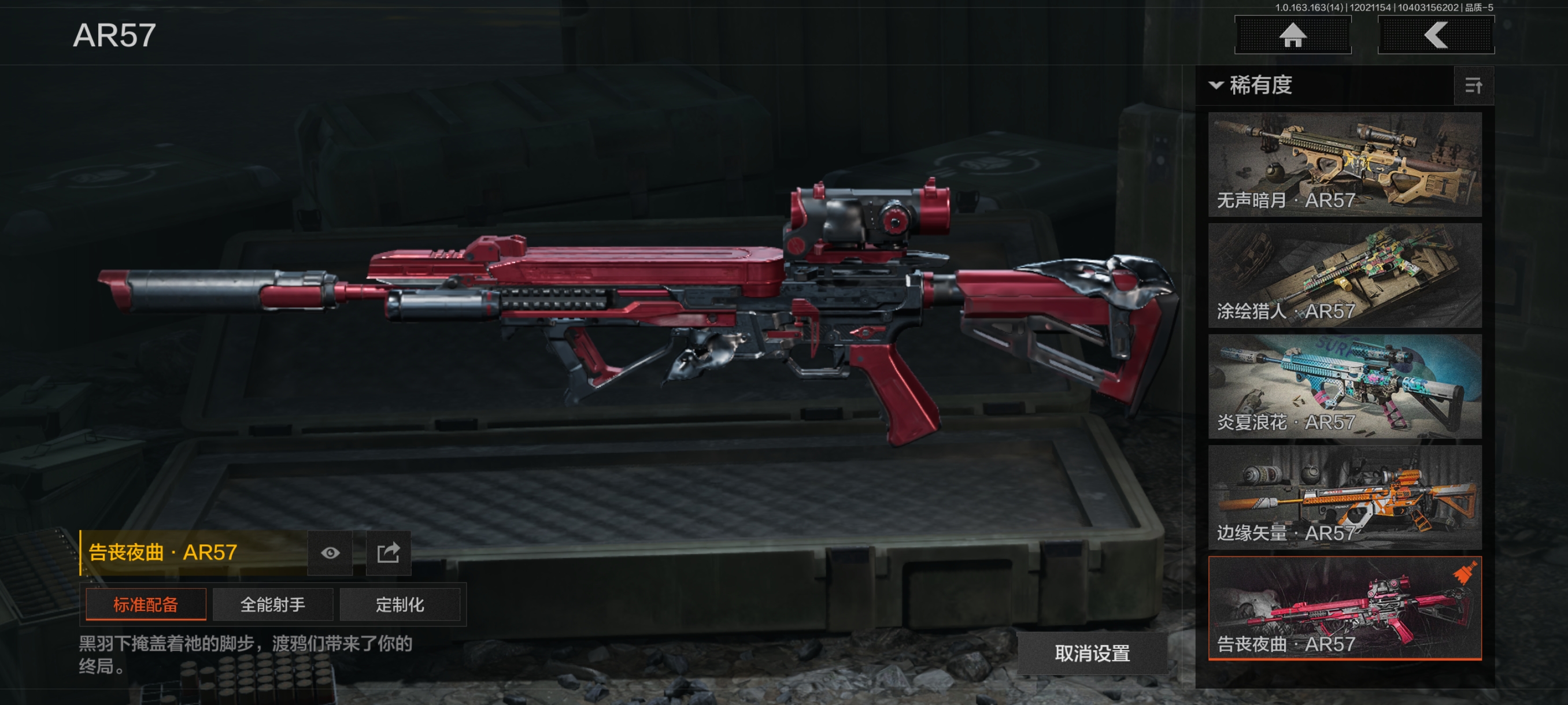 30级,历史**段位:暗区传说【近战武器】:涂鸦利刃,下弦月,冬日冰镐,急袭弯刀,工兵铲,来战开山刀;【角色皮肤】:危崖魅影作战服,城市户外运动套装,野狩骑士套装,王国卫队礼装轻装,都市夜影套装,台风Ⅱ竞技运动服;【手套】:急袭手套;【突击步枪】:包络战术AKM,火力倾泻AKM,猩红抓痕AKM,来战AKM,坚守AKM,潜渊蛇鳞M4A1,战术大师M4A1,诸星之子FAL,和平之手FAL,秋宴FAL,自喷网格H416,蓝色咆哮H416,堕落者H416,鱼跃丹青MDR,竞技DTMDR,涂鸦AK102,来战AK74N,山地伪装AK74N,雪原凌锋AK74N,竞技数码AK74N,坚守AKS74U,龙影AKS74U,竞技AUG,火力倾泻AUG,危崖敌影F2000,醒目提示F2000,炎夏浪花AR57,告丧夜曲AR57,边缘矢量AR57,涂绘猎人AR57,无声暗月AR57,湖冰倒影ACE31,深粉玫瑰ACE31,战术大师AEK,*后防线AEK,虎纹Groza,骤羽尖啸FAMAS,虎纹FAMAS,异彩合金SCAR,青瓷涂层SCAR,森林迷彩T951,绿松石数码T951,彻甲铜斑T951,巡林客T951